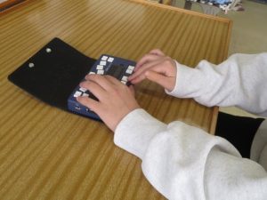 高等部の自立活動で、次は「BMSをするよ~」と話していました。 なんだかわかりますか。 Brail Memo Smart 小型の点字ディスプレイです。 写真1 BMSの操作練習をしています。真ん中の点字表記と音で確認しながら、上の白いキーでタイプライターのように点字を打っていきます。 スペースキーやエンターキーなどもあり、パソコンのようでもあります。少し前から練習していたそうですが、ほんの少し先生からアドバイスをもらうだけで、ほとんど一人で操作できていました。 すごい!!指の形もきれいですね。