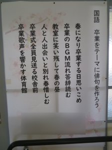 高等部の廊下に貼りだされた俳句、卒業式にちなんだ素直な気持ちを読みました。 写真1 高校生らしい、のびやかなことばが並びます。今年度の卒業式は明後日、よき日となりますように。