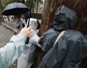 3月3日は中学部が伊勢方面、高等部が南山大学人類学博物館へ校外学習に出かけました。 写真1 雨の中、外宮の参道を歩きました。みんなで杉の幹を取り囲みました。 大きさにびっくりです。写真2 大エビフライ定食を食べた人もいます。さすがの海の幸ですね。