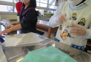 3学期は、アイスボックスクッキーづくりに取り組みました。 材料や作り方を調べたり、材料費から販売価格を計算したり、準備を進めてきました。 少しずつ仕込んだ生地を冷凍して蓄えておき、一気に焼き上げ、職員相手にいざ販売です。 写真1 最後の仕上げ「袋詰め」です。5枚ずつ入れてワイヤーで巻いて留めます。 作業学習で勉強していることが役立つ瞬間です。写真2 お店に出す看板を急いで書いています。 「先着8名様」とのこと、即完売になりそうですね。