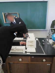 現在の校舎の触察模型(本校の教員手作り)が、どのような作りになっているか確認しています。