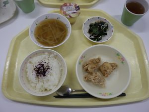 ゆかりごはん からあげ きゅうりの酢の物 味噌汁 プリン