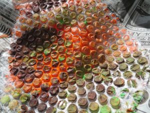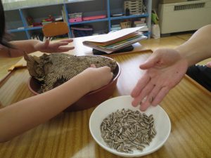「大きなかず」の学習の一環として、畑でとれたひまわりの種を数えることに挑戦します。 写真1 まず、たくさんの種をひとつひとつ手で外してばらばらにします。たくさんあるので外すだけでも大変です。 また、数えている様子や、何個あったかも報告したいと思います。