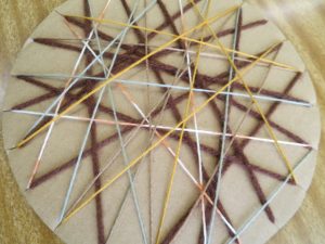 畑のひまわりを、大きさも含めて表現しようとしています。 写真1 花の中心部分その1 段ボールに黄色や茶色、オレンジや薄い水色などの毛糸を巻き付けて表現してみました写真2 花の中心部分その2 ビニールのクッション材(5mmくらいの空気の入ったふくらみがたくさん並んだシート)に、オレンジや茶色、緑の絵具を塗って表現しました