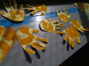 写真3 手形?? 手の形に切り抜いた紙に、オレンジの手の形の色がついたものがたくさんあります。