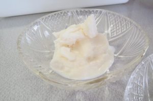 理科では、冷蔵庫に頼らずにアイスクリームをつくることができるか、にチャレンジしました。 写真1 ジップ袋に牛乳と砂糖を入れてしっかり閉めた後、大量の氷と塩を入れたジップ袋の中に袋ごと入れ、激しく振っています。大変なので、友達と交代で10分くらい振り続けました。中の牛乳が少しずつ固まってくるのがわかります。 写真2 牛乳がしっかり固まって、ふんわりとしたアイスクリームになりました。今にも溶け出しそうです。