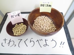 9月25日(水)の給食で出た「ひよこ豆のサラダ」。ひよこ豆ってなんだ?ということで、食堂前に本物を用意してもらいました。 写真1 調理前の乾燥ひよこ豆と、比較できるよう大豆を並べて置いてあります。大豆はツルツルしているけど、ひよこ豆はちょっとごつごつしていて、出っ張っているところもあるそうです。 「ひよこ」の名前はどこからきたのか、触るとわかるかもしれませんね。
