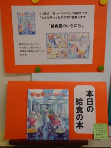 今月は読書週間にちなんで「読書コラボ給食」を実施します。司書の先生に選んでもらった、図書室にある本のレシピが登場します。今日は『おばけのてんぷら』から「野菜のてんぷら」の登場です。本は食堂前にも掲示しています。給食では3種類の天ぷらです。何の天ぷらか、食べてあててください。
