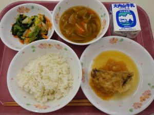 ごはん、牛乳、さばのみぞれ煮、白菜と小松菜のごまあえ、さつま汁