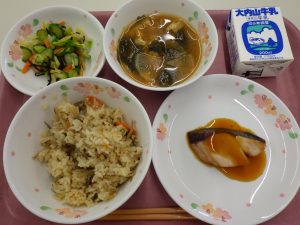 炊き込みごはん、牛乳、魚のてり焼き、白菜の昆布あえ、みそ汁