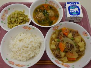 ごはん、牛乳、肉じゃが、ツナとキャベツのカレー炒め、あじのつみれ汁