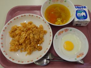 大阪・関西万博では世界のたくさんの国が出展しています。今日はインドネシアのメニューです。ナシゴレンのナシはご飯、ゴレンは炒めるという意味で、インドネシアのチャーハンです。普段のチャーハンと違うのは、ナンプラーやトウバンジャンを使うところです。別のお皿に目玉焼きがあるので、ナシゴレンの上にのせて食べてもよいです。ソトアヤムのソトは具だくさんスープ、アヤムは鶏肉という意味で、鶏肉の具だくさんスープです。インドネシアの定番料理で、家庭や地域によって色々なソトアヤムがあるそうです。