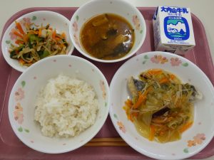 ごはん、牛乳、揚げ魚の和風あんかけ、青菜とエリンギのあえもの、みそ汁
