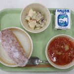 2025年11月11日 / 最終更新日時 : 2025年11月11日 編集者 給食 11月7日の給食 今日の献立は、「シュガー揚げパン・牛乳・さつまいものヨーグルトサラダ・ABCトマトスープ」です。シュガー揚げパンは、新メニューです。3種類の砂糖をブレンドして、まぶしました。サラダは、さつまいもとりんごの甘さが際立ちまし […]