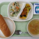 2025年10月6日 / 最終更新日時 : 2025年10月6日 編集者 給食 10月3日の給食 今日の献立は、「米粉パン・牛乳・かぼちゃのマヨチーズ焼き・キャベツと枝豆のサラダ・イタリアンスープ」です。かぼちゃやブロッコリーにマヨネーズ+牛乳+チーズで作ったタレをかけて焼き、パンにつけて食べてもおいしいパテ風にしま […]