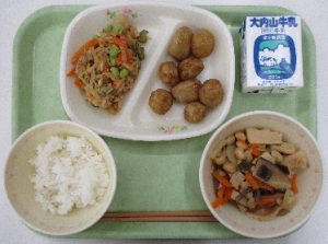 今日の献立は、「黒糖パン・牛乳・鮭の米粉ムニエル・きのこのソテー・さつまいものポタージュ」です。ムニエルは、鮭に塩コショウで下味をつけ、米粉とバターをまぶしてオーブンで焼きました。しめじ、エリンギ、えのきなど秋の味覚のきのこをソテーにしました。きのこには、体の防御力を高める働きがあり、風邪やインフルエンザなどの感染症予防に役立ちます。