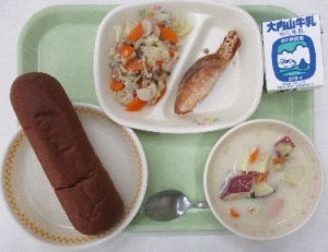 今日の献立は、「ご飯・牛乳・八宝菜・ダブルポテトサラダ」です。今日は具だくさんの八宝菜をご飯の上にかけて食べました。八宝菜と中華丼(中華飯)はどこが違うんだろう???と調べてみたら、ほぼ同じもので「ご飯の上にあんがかけられているかどうか」という違いだそうです。八宝菜をご飯の上にかけたからといって、八宝菜丼にはならず、中華丼になるんですね。