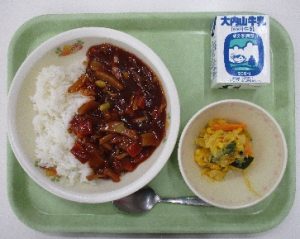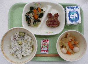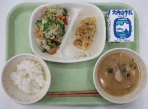 今日の献立は、「ご飯・牛乳・タラのクリームコーン焼き・ごまちくサラダ・豆乳汁」です。タラは、低脂肪・高タンパク質の魚で、かつ必要な栄養素がたっぷりのダイエットに最適な魚です。あっさりとして淡白ですが、うま味が豊富です。今日は、クリームコーンや玉ねぎなどで作ったソースをかけて焼きました。
