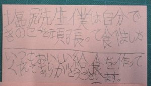 今日の献立は、「きのこのクリームスパゲッティ・牛乳・れんこんのサクサクサラダ・コアぶどうヨーグルト」です。しめじやえのきなどのキノコ類とホタテの貝柱からのうま味を利用して、柔らかいクリームスープを作りました。スパゲッティの上にかけて食べている人がほとんどでしたが、中には「つけ麺」のようにして食べている人もいました。秋の季語でもある「きのこ」を、今月も多く取り入れています。児童生徒の中には、きのこ類が苦手な人もいるようですが、担任の先生の励ましから、「食べれるようになったよ!」と手紙をいただきました。