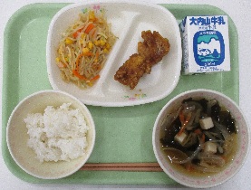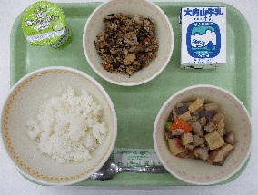 今日の献立は、「ご飯・牛乳・和風そぼろ・がめ煮・梨ランスゼリー」です。和風そぼろは、具だくさんで栄養豊富なみそ味のそぼろです。切干大根、ひじき、ごぼうなどを細かく切り、生姜の香りを大切にしました。和風素材のうま味と「みそ」のコクがよく合い、白いご飯にピッタリです。「がめ煮」は、別名「筑前煮」で福岡県の郷土料理です。デザートは、和梨とラフランスが組み合わさった甘いゼリーでした。