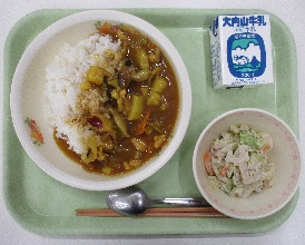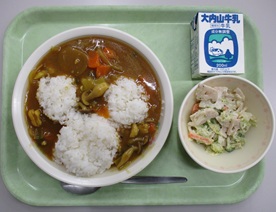 今日の献立は、「きのこ入りチキンカレーライス・牛乳・れんこんサラダ」です。