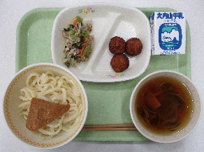 今日の献立は、「けつねうろん・牛乳・揚げたこやき・野菜の南高梅あえ」です。明日から高等部3年生が、大阪・和歌山方面に修学旅行に行きます。そこで今日は、その地方にゆかりのある献立にしました。「けつねうろん」は、「きつねうどん」を指し、主に大阪や関西地方の方言です。たこ焼きは市販のものを油で揚げました。香ばしく、中がフワフワでした。南高梅は、和歌山県を生産地とする最高級の梅です。大阪や和歌山に行った気持ちになって食べました。