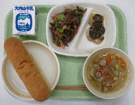 今日の献立は、「米粉パン・牛乳・鶏肉の照焼ゴマソースがけ・こんにゃくソテー・大根スープ」です。鶏肉の塩コショウの下味を付けて焼き、黒ごま+白ごまペースト+砂糖+しょうゆ+酢+みりんで作ったソースをかけました。このゴマソースがまた絶品で、パンにつけて食べても美味しかったです。ソテーは、こんにゃくの食感と生姜の味がクセになる一品でした。