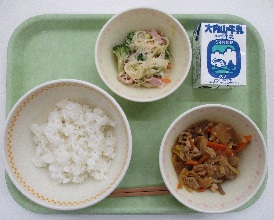 今日の献立は、「ご飯・牛乳・豚肉と豆腐のキムチ煮込み・ビーフンのごまネーズサラダ」です。キムチは、乳酸菌の数が多い発酵食品のため、腸内環境を整える効果が期待できます。また、血行促進や代謝を高める効果もあり、寒い日にはもってこいの食材です。今日は、豚肉や豆腐と一緒に炒め煮にしました。ご飯にかけて食べている人もいました。サラダは安心する感じのおいしさの一品でした。
