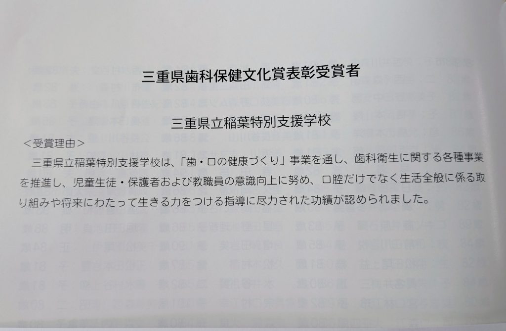 2025年12月19日 / 最終更新日時 : 2025年12月19日 情報担当 お知らせ 三重県歯科保健文化賞を受賞しました 「歯科衛生に関する各種事業を推進し、口腔だけでなく生活全般に係る取組や、将来にわたって生きる力をつける指導に尽力された」ことが認められ、三重県歯科保健文化賞を受賞しました。