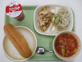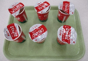 今日の献立は、「セルフツナサンド(パン+ツナサラダ)・アシドミルク・ミネストローネ・マカロニあべかわ」です。キャベツやキュウリをたっぷり使ったツナサラダをパンにはさんで食べました。月に一度のアシドミルク(発酵乳)のパッケージがクリスマスバージョンで、赤と緑の色がかわいかったです。食堂で食べていると、高等部の生徒が「1番から6番を全部そろえたよ!」とアシドミルクをお盆に並べて見せてくれました。何の番号か最初はわからず、よくよく見てみると、ふたの部分の「A」というキャラクターの下に番号がふられていました。「この番号は何だろう…」と思い、工場に電話をして確認したところ、「製造ラインの番号です。」と教えてもらいました。