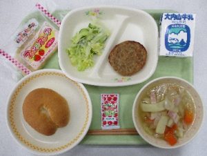 今日の献立は、「セルフハンバーガー(パン+ハンバーグ+そえ野菜)・牛乳・白菜のスープ・いちごクレープ」です。2026年の最初の給食は、ハンバーガーです。バーガーパンの切れ目に、ハンバーグとキャベツ等の野菜をはさんで、ケチャップをかけて食べました。スープには旬の白菜をたっぷり使いました。今年もよろしくお願いします。みんなが楽しく食べれて、安心安全な給食作りを頑張ります!