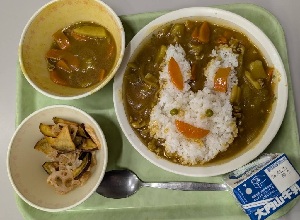 今日の献立は、「ポークカレーライス・牛乳・根菜チップス」です。月の一度のカレーライス、今月は豚肉のシンプルカレーです。高等部1年D組では、ご飯はうさぎ型、人参が耳や口、グリーンピースが目になっていました。この盛り付けには少し時間がかかるので、フォロー体制を組んでクラスのみんなで協力してできた作品だと思います。食べるのがもったいない程かわいかったです。根菜チップスは、レンコンとさつまいもを素揚げしました。カレーにのせて食べている人もいました。