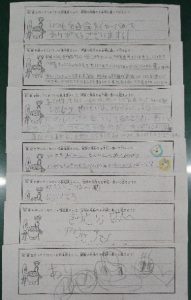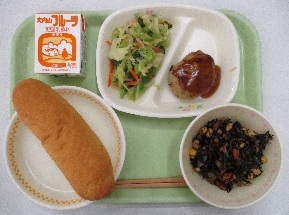 全国学校給食週間最終日の今日の献立は、「米粉パン・フルーツ牛乳・まこたけ和風ハンバーグ・こんにゃく麺サラダ・伊勢ひじきのケチャップ炒め」です。三重県産のマコモダケ+タケノコを細かく切って「おから」と混ぜフワフワのハンバーグを作りました。砂糖醤油+みりんで照り焼きソースを作ってかけました。サラダには、飯高町にある「香肌こんにゃく麺」を使用しました。三重なばなやキャベツとあえて、さっぱり味サラダになりました。ひじきは、和食のイメージですが、ケチャップやコンソメで調味し、パンにも合う洋食の炒め物にしました。1月の食育だよりで「給食調理員さんに感謝の気持ちの手紙」を募集したところ、たくさんの方が書いてくれました。「いつもありがとう!」という嬉しい言葉がたくさん詰まっていました。