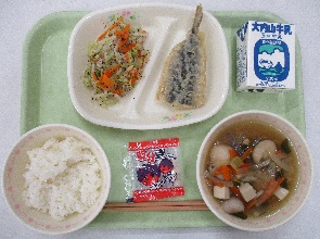 今日の献立は、「ご飯・牛乳・ゴマつくね焼き・まごわやさしい煮・豆乳汁」です。ごまつくね焼きは、鶏ひき肉を使いました。えのきたけと玉ねぎをみじん切りにし、鶏肉と混ぜ、調味料を合わせます。小判型に形成し上にゴマをのせて焼きました。あっさりとした味で、でもコクや深みもあり、何個でも食べれそうでした。副菜の煮物は、新メニューで、「まごわやさしい」とは、健康的な食生活を目指すために摂り入れたい7つの和の食材の頭文字を並べた語呂合わせです。大豆+ごぼう+ひじき+にんじん+ツナ+椎茸+さつまいもを炒め煮しました。豆乳汁は、みそ汁に豆乳を入れることで、味噌の使用量を減らすことができます。健康や美容に良いといわれる「大豆イソフラボン」をたっぷりとれました。