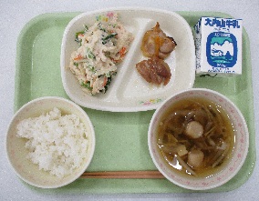 今日の献立は、「ご飯・牛乳・鶏肉のマーマレード焼き・おからサラダ・すまし汁」です。鶏肉とマーマレードジャム+しょうゆに漬け込み、優しい甘さの照焼になりました。姿を変える大豆月間の今日は「おから」です。「おから」を煎りつけながら砂糖+しょうゆ+みりんで下味をつけ、なばな+ハム+玉ねぎ+人参と合わせ、最後にマヨネーズ+ヨーグルトで調味しました。「今日のサラダ、めっちゃおいしい!」とたくさんの人からの声が届きました。サラダのレシピを2月の食育だよりにのせますね!