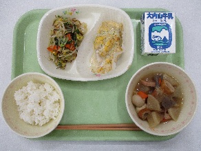 今日の献立は、「ご飯・牛乳・さわらの黄身焼き・白菜の塩昆布あえ・関東煮」です。炒り卵+玉ねぎのみじん切り+マヨネーズ+パセリを混ぜたものを魚の上にのせて焼きました。黄色の中に緑や茶色が少し混ざって、まるで「菜の花畑」のような色合いでした。塩昆布あえは、白菜+水菜+もやし+人参と塩昆布を混ぜたものです。煮物は、関東風の「煮込みおでん」で、大根は柔らかく、れんこんはシャキシャキ、こんにゃく、ちくわの歯ごたえもあり、いろいろな食感が楽しめました。