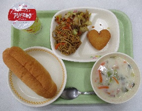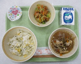 今日の献立は、「菜の花ごはん・牛乳・厚揚げのサラダ・豚汁・チョコプリン」です。そろそろ菜の花が咲く季節になりそうです。スクランブルエッグと「菜めし」をご飯に混ぜ、菜の花畑の色合いになりました。スクランブルエッグがフワフワで、ほんのり塩気があり、パクパク食が進みました。サラダは新メニューで、厚揚げに片栗粉をつけ、油で揚げました。揚げてある厚揚げを再び揚げ直すという手間により香ばしさが出て、調味料の使用量をひかえた味付けができました。豚汁は、いつもは豚コマ肉を使いますが、今日は挽き肉を使いました。旨味が出てて、ほっと一息、癒されました。プリンはハートの形で、かわいかったです。