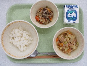 今日の献立は、「ご飯・牛乳・ツナじゃが・牛肉入り切干大根のチャプチェ」です。チャプチェは韓国料理の一つで、春雨の代わりに切干大根を使いました。切干大根が牛肉の旨味を吸い込んでくれました。ツナじゃが煮は、たけのこをたっぷり入れました。ホクホクのじゃがいもにコリコリした竹の子の食感が面白かったです。