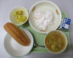 今日の献立は、「フルーツサンド・牛乳・じゃがいものカレーマヨあえ・イタリアンスープ」です。フルーツ(みかん+黄桃+パイン)缶詰とホイップクリームを混ぜたものをパンにはさんで食べました。じゃがいものカレーマヨあえは、新メニューです。カレー味が出しゃばることなく、クリーミィで、パンにはさんで食べている人もいました。スープは安定の美味しさでした。バレンタインの今月は、いろいろなところでハートの形を見ますが、なんと今日は「フルーツ生クリームあえ」がハート型に盛り付けてありました。難しかっただろうなぁ…。