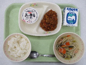 今日の献立は、「ナン・キーマカレー・フルーツ牛乳・やきとりサラダ」です。ナンは、高等部1年B組からのリクエストです。じゃがいもだけでなく、コーンや大豆をたっぷり使ったキーマカレーをナンの上にのせて食べました。ナンがおいしかったからか、1つでは物足りず、周りを見渡して、ナンを食べている人をジーっと見つめている生徒がいました。サラダは、鶏肉に下味を付けてオーブンで焼き、茹でた野菜と和えました。