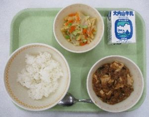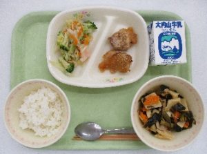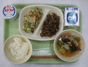 今日の献立は、「ご飯・牛乳・春がつおとごぼうの時雨煮・春野菜のおかかマヨあえ・じゃがいものスープ・コアヨーグルト」です。時雨煮は、濃いめの味付けで、ご飯との相性が抜群に良かったです。おかかマヨあえは、旬野菜のキャベツやアスパラガスをたっぷり使いました。マヨネーズで混ぜるだけでなく、花かつおを入れることでダシのうま味が出て、マヨネーズの量を少なくすることができました。