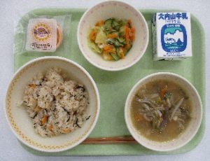 今日の献立は、「たけのことツナのご飯・牛乳・豚汁・春キャベツとパインのサラダ・焼きプリンタルト」です。たけのこ+人参+ひじき+干し椎茸+油揚げ+ツナをダシ汁で煮て、混ぜご飯の素を作り、炊きあがった白ご飯と混ぜ合わせ、優しい味の混ぜご飯ができました。サラダは、甘酸っぱいパインの味がアクセントになっていました。豚汁はいろいろな食材のうま味が出て癒される一品でした。