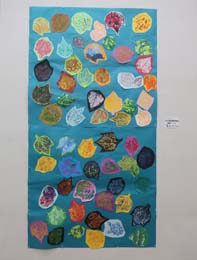 今年も「みえ高文祭」が、三重県総合文化センターで開催されました。特別支援学校部門に、草の実分校からも共同作品『葉っぱのスタンプ』を展示しました。学校周りの葉っぱに直接絵の具をつけて、色画用紙に写し取ったり、パウチした葉っぱの上から色画用紙を貼って葉っぱの形を作ったりしました。きれいな葉っぱがたくさんできあがりました。みんなの葉っぱを貼り合わせたら、素敵な共同作品ができあがりました。文化祭にも展示します。是非ご覧ください。 | |