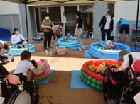 梅雨の晴れ間、中庭にプールを出して水遊びをしました。子どもたちは水着に着替えて、温かいお湯の入ったプールにつかって気持ちよさそうにしていました。プールに色とりどりのボールをたくさん浮かべたり、ジョウロや水鉄砲で遊んだりしました。 | |