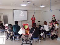 ALTの先生が、スリムなサンタクロースになって、小学部のお友だちのところに来てくれました。アメリカのクリスマスの様子を教えてもらったり、クリスマスソングをいっしょに歌ったりしました。子どもたち1人ひとりから、サンタさんにプレゼントも渡しました。もちろん、ベッドサイドのお友だちのところにも、来てくれましたよ! | |