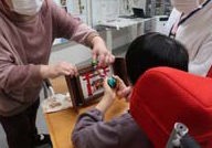 1月の生活では、お正月について学習しました。料理、遊び、飾りや歌など色々なものがあることを知り、実際に触ったり遊んだりしてお正月の文化に触れました。おせちがプリントされた箱は本物のようで、何度も触って確かめていました。また、自分たちで作った凧に風を当ててもらい、紐をひっぱって凧あげ体験もしました。 | |