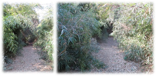 先日来の雪で運動場裏の山道入り口に、笹が倒れて通るのが難しくなっていましたが、教員有志で芝刈