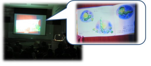部屋を暗くして、OHPで大きく絵本のページを映し出すことで、見やすく注目しやすく、多くの生徒がよく集中していました。