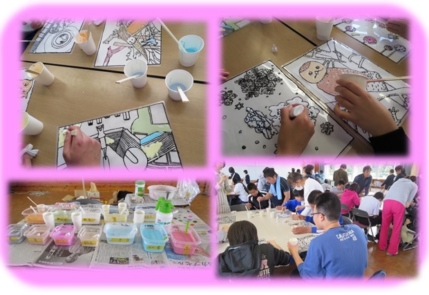 12月8日は、高等部1年が三重県美術館の「アートでつなぐ」事業の一環として、美術館の方と美大の先生や学生が来校し、1日ステンドグラス制作をご指導いただきました。木工ボンドに食用色素を混ぜた画材をアクリル板の上に塗って思い思いの作品を作りました。皆集中して取り組み、個性あふれる作品となっていました。完成品は2月に三重県美術館に展示していただける予定です。