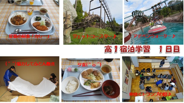 1日目は鈴鹿サーキット、友だちや先生と相談しながらジェットコースターや観覧車などにチャレンジしていました。食事や入浴、就寝、といつもなら家族と過ごす時間も友だちと過ごし、仲間意識は高まったようです。